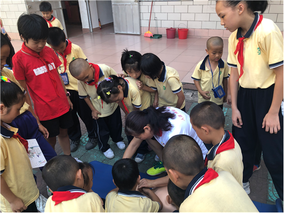 “每次按压后必须放松,掌根不得离开患者胸部,按压时双肩前倾至患者胸部正上方……”9月17日下午,在始兴县高峰小学的阶梯课室里,县科协和县红十字会邀请的红十字会应急救护培训讲师邓春燕正为同学们做心肺复苏急救操作示范。