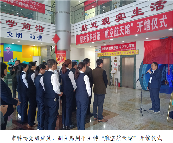 11月26日,市科协、举行了市科技馆“航空航天馆”的开馆仪式,本次仪式由市科协党组成员、副主席周平主持,省科协党组成员、专职副主席、机关党委书记冯日光、韶关市政协党组成员、副主席王德雄、广东省科技工作者与企业创新服务中心主任何少强、市科协主席成绍强、市科协党组书记、副主席罗金锋等领导出席了本次开馆仪式。仪式结束后,各领导在科技辅导员的讲解下对航空航天馆进行了参观。