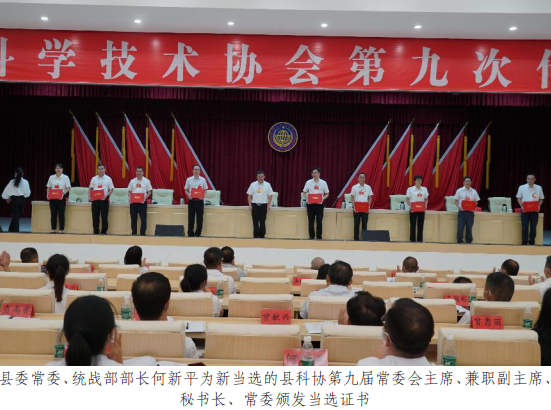 县委常委、统战部部长何新平为新当选的县科协第九届常委会主席、兼职副主席、秘书长、常委颁发当选证书,并在闭幕式上讲话。