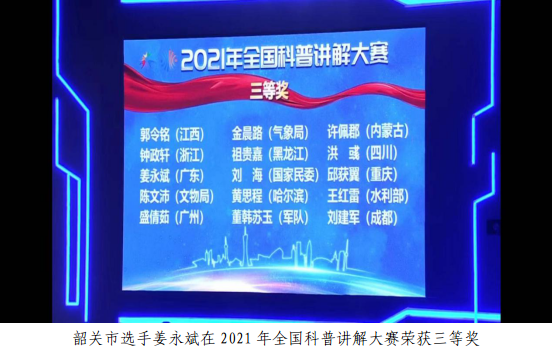 由韶关市科技局和科协联合选送的姜永斌同志(2021年广东省科普讲解大赛一等奖获得者),代表广东省“出征”。在淘汰率接近80%的情况下,虽身体抱恙,但顽强拼搏,经过激烈角逐,荣获全国三等奖,全国人气奖14强,实现了我市科普讲解“国赛”获奖“零的突破”,是迄今为止我市在科普讲解赛事中历史最好成绩。