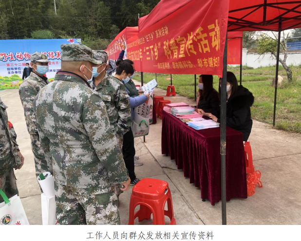 活动现场,工作人员通过悬挂宣传横幅、发放宣传资料、利用语音广播、摆放展板以及咨询讲解等方式,向广大群众普及了《中华人民共和国野生动物保护法》《广东省国家重点保护陆生野生动物名录》等野生动物保护法律法规及有关政策,加强群众对国家保护野生动物的认识,自觉保持与野生动物的“安全距离”;倡导关爱动物,科学救助,发现不明原因受伤、病危、死亡的野生动物,及时向当地林业部门报告;摒弃陋习,拒食野味,自觉抵制和劝阻他人购买、食用野生动物,积极举报非法猎捕野生动物及破坏受保护野生动物生活环境等违法犯罪行为。