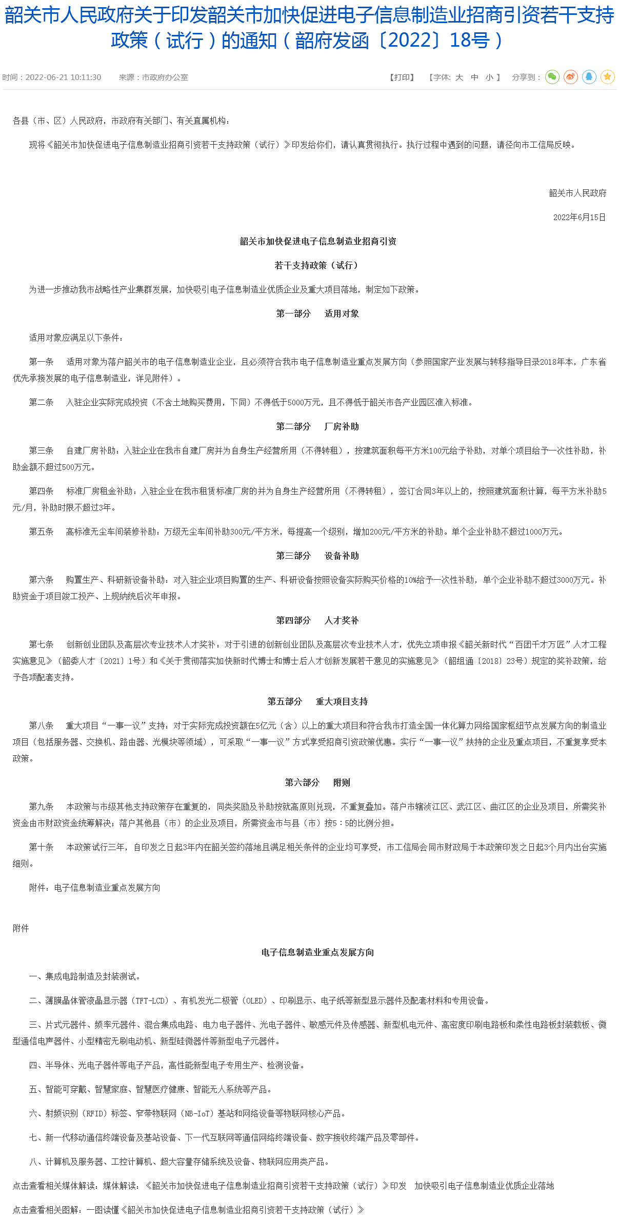 韶关市人民政府关于印发韶关市加快促进电子信息制造业招商引资若干支持政策(试行)的通知(韶府发函〔2022〕18号)