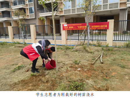植树现场,志愿者们精神抖擞,干劲十足,三五成组,分工协作,挖坑、种树、填土、浇水,每个环节有条不紊,衔接有序,经过近两个小时的挥汗奋战,20株乐昌含笑树苗在校门口安家落户,迎着春风焕发出勃勃生机。