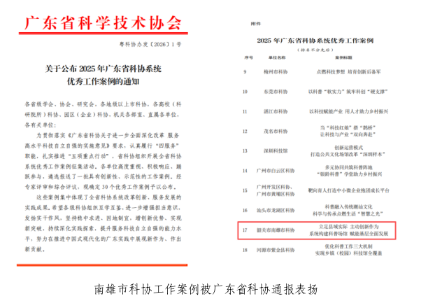 近日,广东省科学技术协会公布2025年全省科协系统30个优秀工作案例,南雄市科学技术协会《立足县域实际 主动创新作为 系统构建科普场馆 赋能基层全面发展》案例成功入选,成为韶关市唯一获此荣誉的县(市、区)。