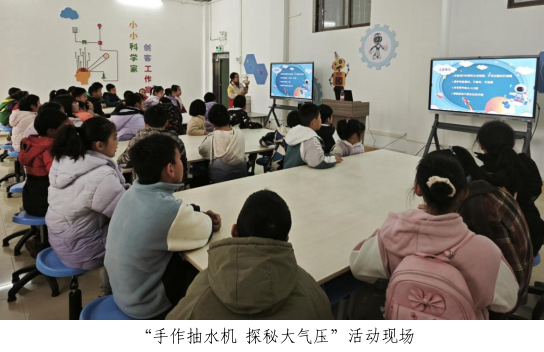 在趣味科学实验环节,科普志愿者以老式压水井为切入点,结合实物展示、动画演示,为孩子们拆解压水井核心构造,用通俗语言解读大气压工作原理,揭秘单向阀、杠杆原理的科学逻辑。互动问答环节中,“为什么压水井要先加引水”“手柄越长越省力吗”等问题激发孩子们主动思考,帮助其建立清晰的科学认知。动手实践阶段,孩子们参与木质手压抽水机拼装,在科普志愿者的细致指导下,完成固定底座、组装手柄、连接软管、调试单向阀等一系列操作,主动交流排查组装偏差,亲手见证抽水机压出水流的瞬间,将大气压吸水的理论知识与实践操作深度结合,真正在“做中学、学中乐”中提升动手协调与空间思维能力。