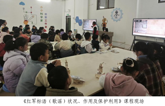科学实验课后,红色主题环节接续开展。工作人员结合南雄本地红色资源,为孩子们讲述红军标语(歌谣)状况、作用及保护利用,重温革命先辈在南雄的奋斗历程,让孩子们感受红色历史的温度与力量。随后,大家齐声献唱《当红军歌》,激昂的歌声传递出对革命先辈的崇敬之情,在传唱红色歌曲中感悟革命精神,深化对红色文化的理解与认同。