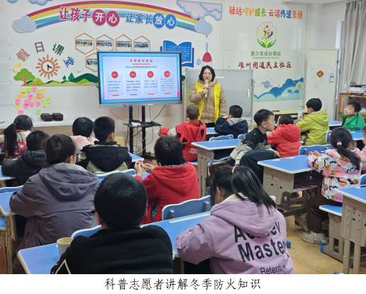 讲座中,科普志愿者结合冬季火灾特点,通过案例与图文,详细讲解家庭常见火灾隐患、安全用电用气、初起火灾扑救及火场逃生自救等知识,重点强调取暖设备安全、燃气泄漏处置等注意事项,引导学生养成“人走电断、火熄气关”的良好习惯。
