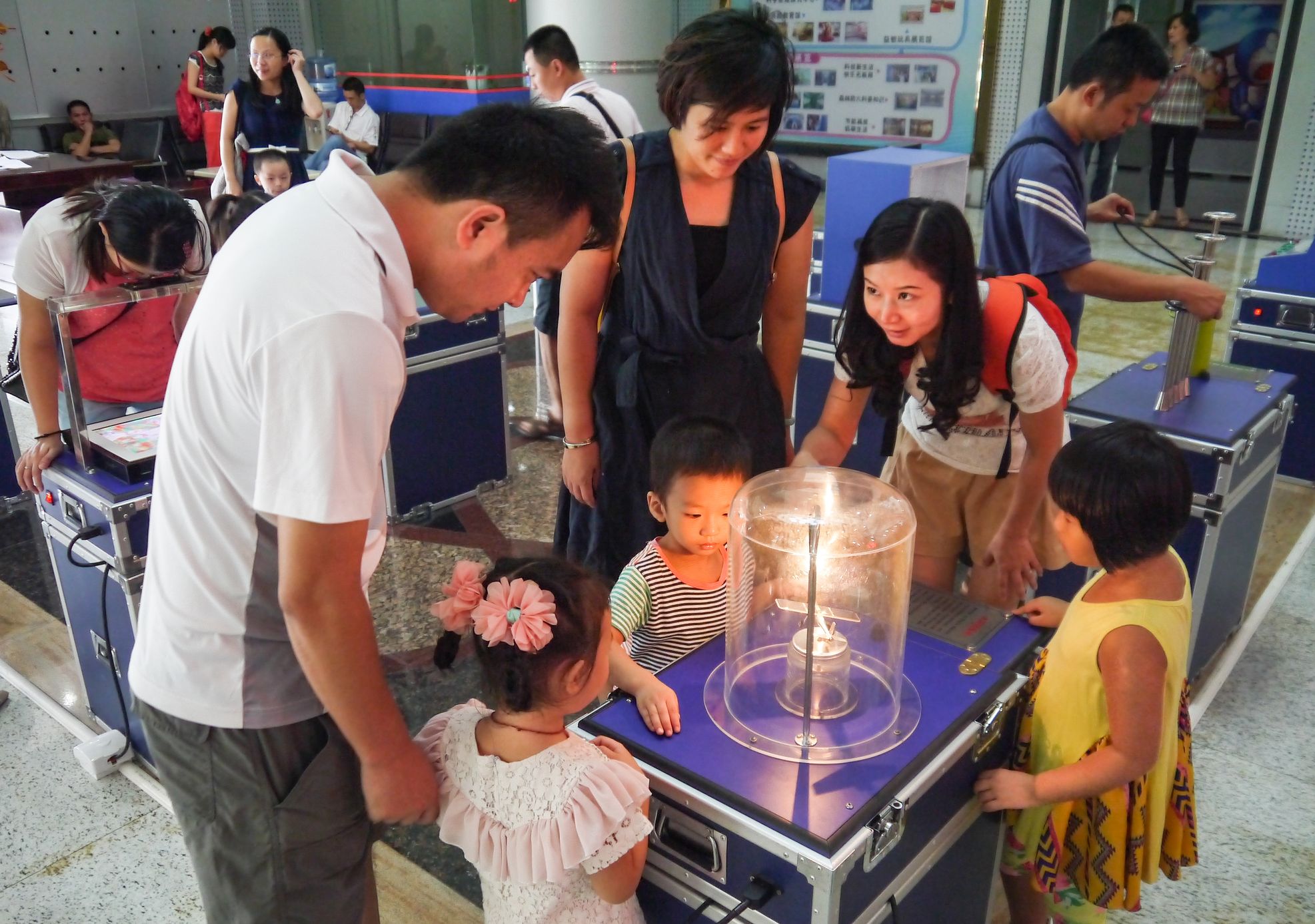 家长与小朋友们正在探索流动车载展品中的奥秘