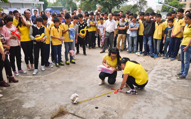 科技辅导员正在测量“鸡蛋撞地球”实验比赛结果