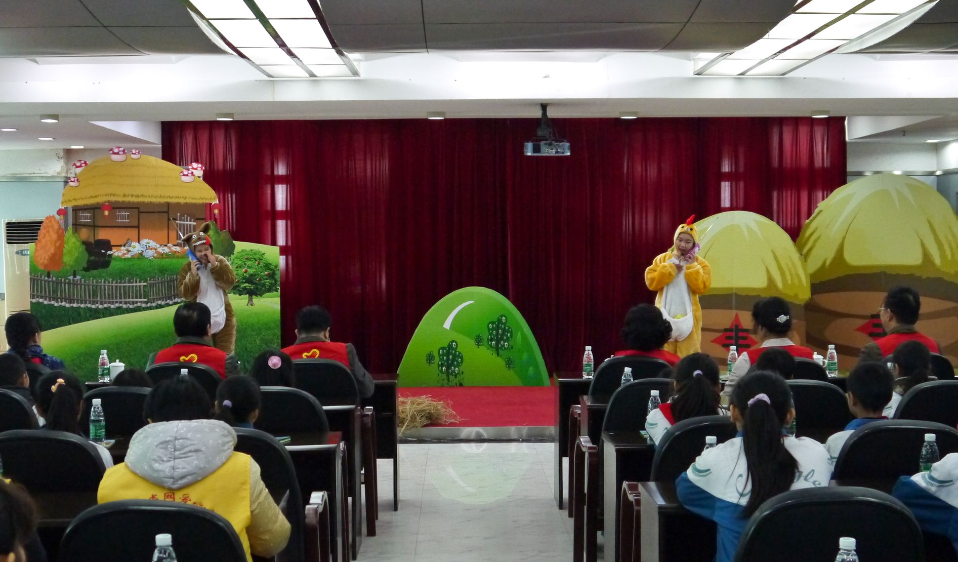 领导及留守儿童正在观看科技馆自编、自导、自演科普剧