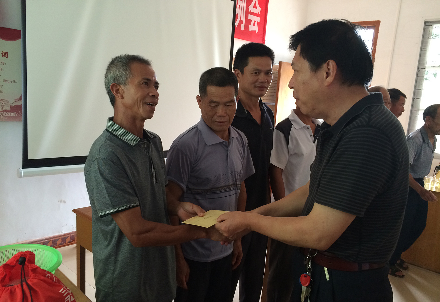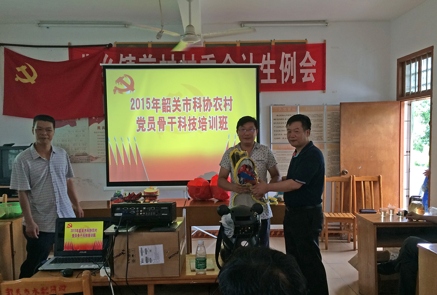 市科协副调研员陈添辉为村委赠送文体用品