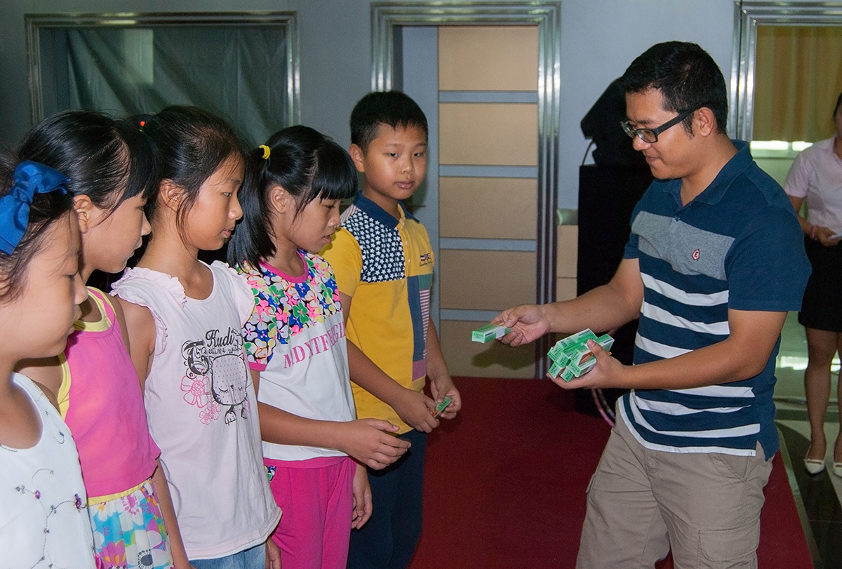 工作人员为正确回答出问题的同学赠送小礼品