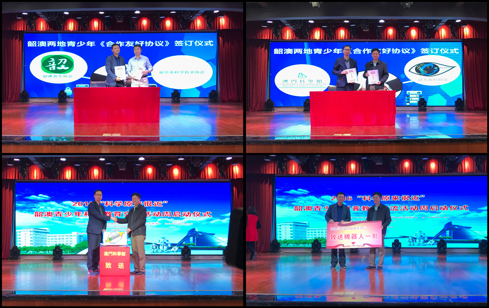 为更好地促进韶关、澳门两地青少年科普学术合作交流,增进两地友谊,推动两地科普工作发展。2016年12月24日,由韶关市政协港澳台侨联络委、团市委、市科协、市教育局、市青联、澳门科学馆、韶澳青年协会主办的“2016‘科学原来很近’韶澳青少年科普教育交流周活动”启动仪式在市青少年宫举行。市政协副主席林嘉、韶澳青年协会会长卢德基、澳门科学馆馆长邵汉彬、澳门科学馆教育及展品总监兼韶澳青年协会副会长梁思聪、韶澳青年协会副会长谢誓宏、澳门科学馆主管兼韶澳青联协会副会长章剑峰、团市委书记刘海旺、市科协主席成绍强、市科协副调研员陈添辉、市教育局副局长曾楚清、市青少年宫主任谭祥红等领导和嘉宾出席了活动。