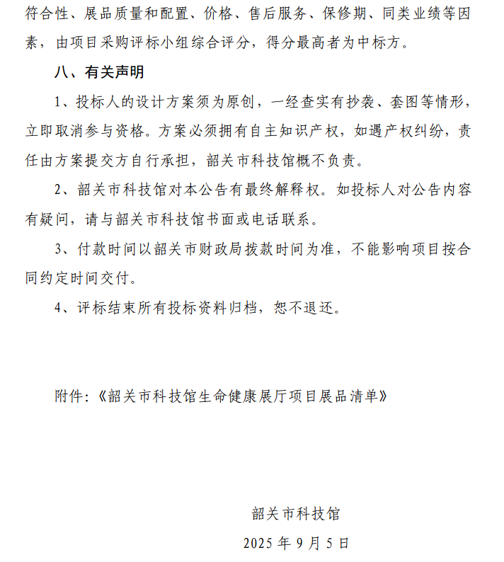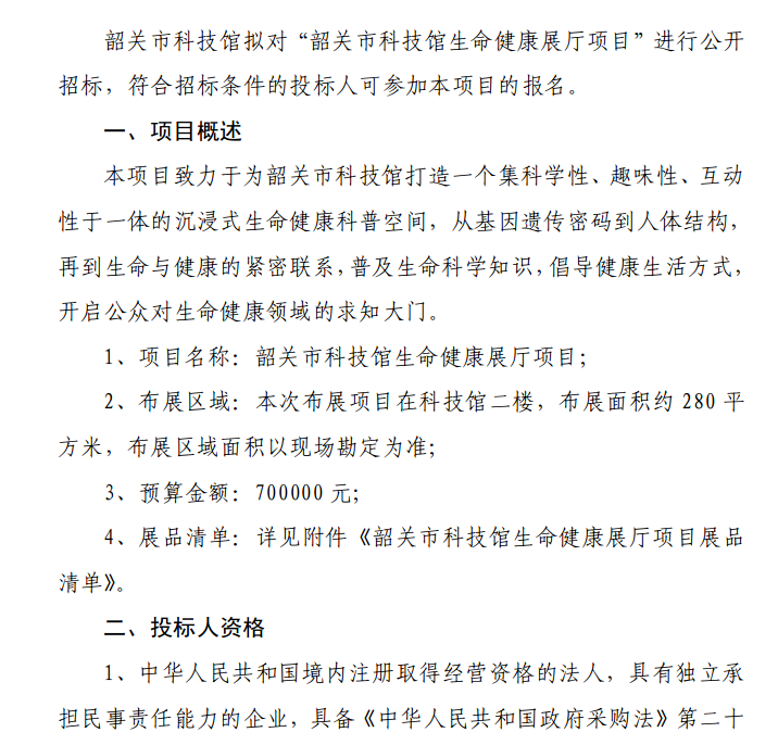 韶关市科技馆生命健康展厅项目采购公告
