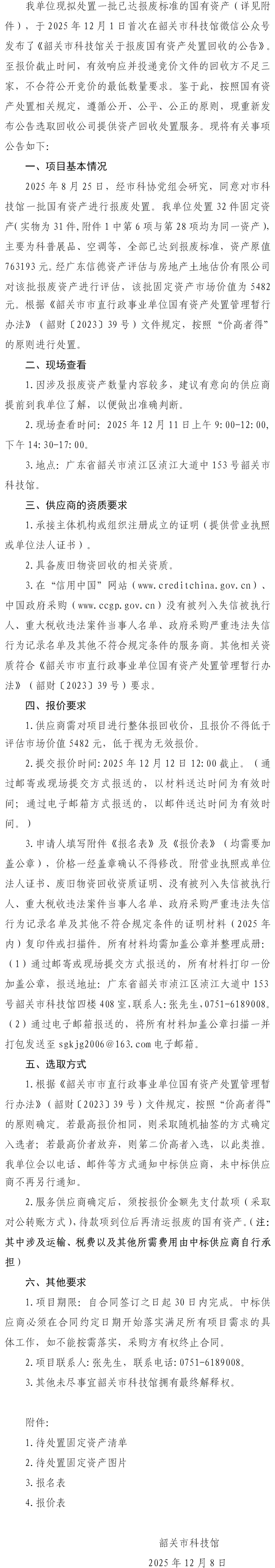 韶关市科技馆关于重新发布报废国有资产处置回收的公告